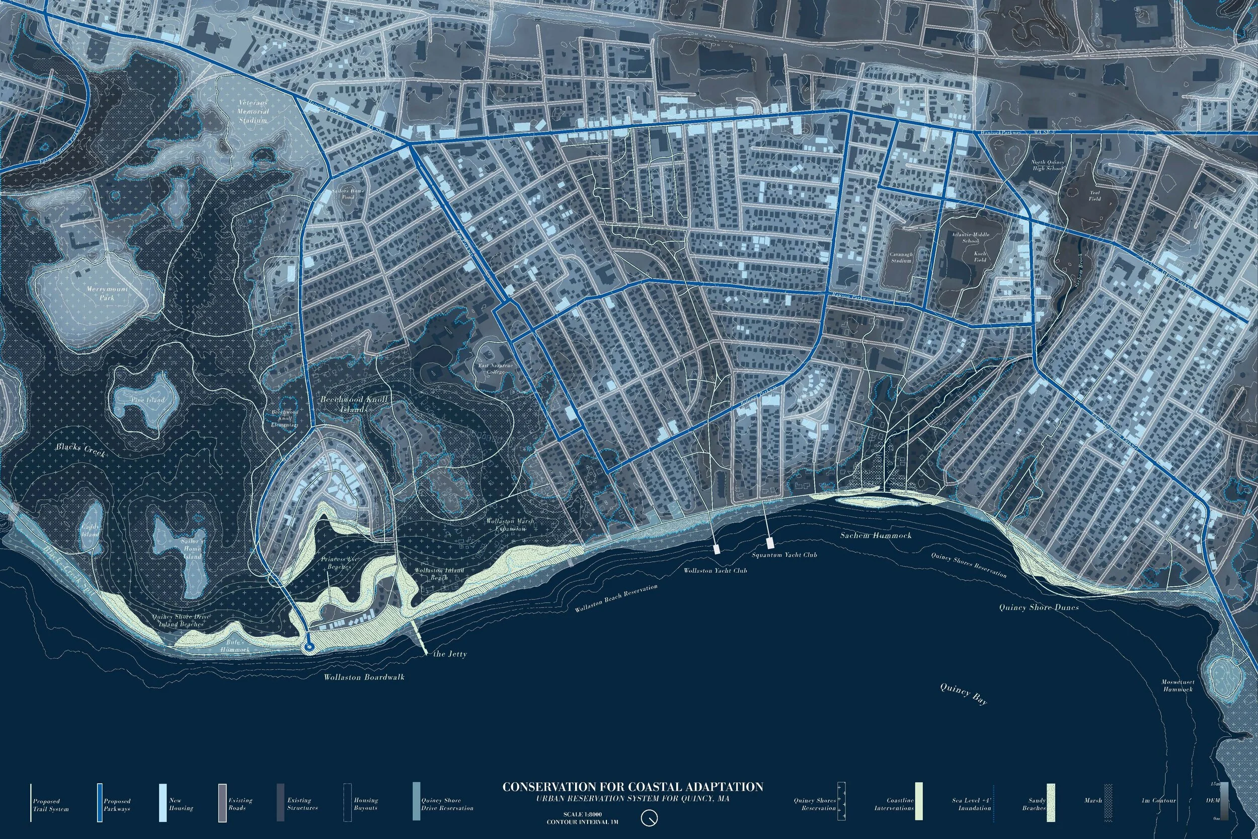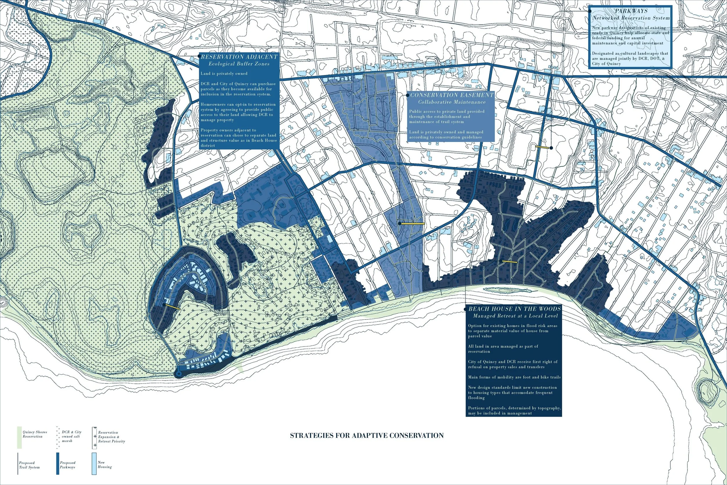 This project transforms Quincy Shore Drive from a four lane roadway to a landscape managed as part of the DCR reservation system: maintaining values of public access, but altering how this historic beach community relates to the changing coastline. It expands the Quincy Shores Reservation from the beach into North Quincy through a trail network, a parkway system, and new land classifications: reservation adjacent, conservation easement, and beach house in the woods. It also introduces alternative means of valuing private property as a way of redistributing density to reflect the gradient of wateriness in Quincy. Together, Mass DCR, the City of Quincy, and private homeowners transform and expand the reservation through a collaborative, adaptive maintenance strategy.