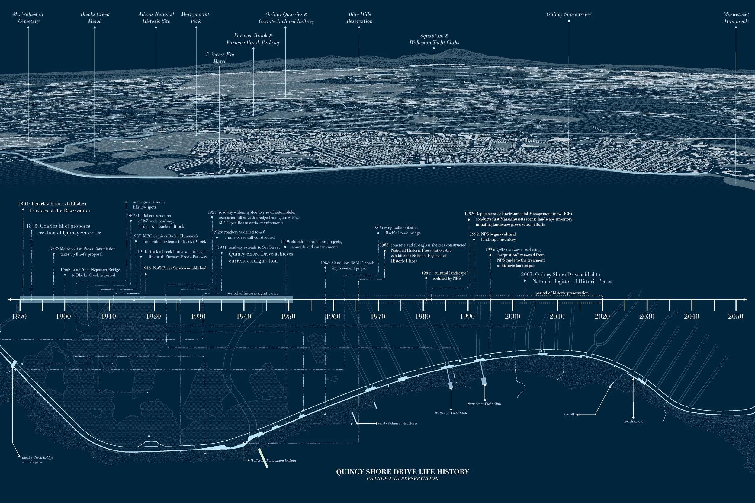 Current modes of landscape conservation, historic preservation, and city maintenance practices prescribe a future that problematically resembles the present. The preservation of Quincy Shore Drive, a parkway designed by Charles Eliot on the National Register of Historic Places in Massachusetts, represents how the current paradigm of cultural landscape conservation is in direct opposition to necessary climate adaptations for it’s urban, waterfront context. To maintain its historic landmark status, Quincy Shore Drive must be consistently managed so that the materials of construction, placement of historic structures, and tree plantings remain faithful to the “original” and are continually restored to the periods of historical significance (roughly 1890-1950). This paradigm of preservation causes the artificial line separating land and water to also be maintained, and reinforcing this edge makes it increasingly risky for people to live North Quincy.